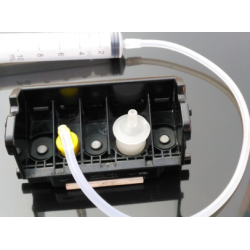 Napełniamy płaskie naczynie płynem i zanurzamy głowicę (w takiej pozycji jak jest w drukarce) max. na wysokość dysz do kilku godzin.